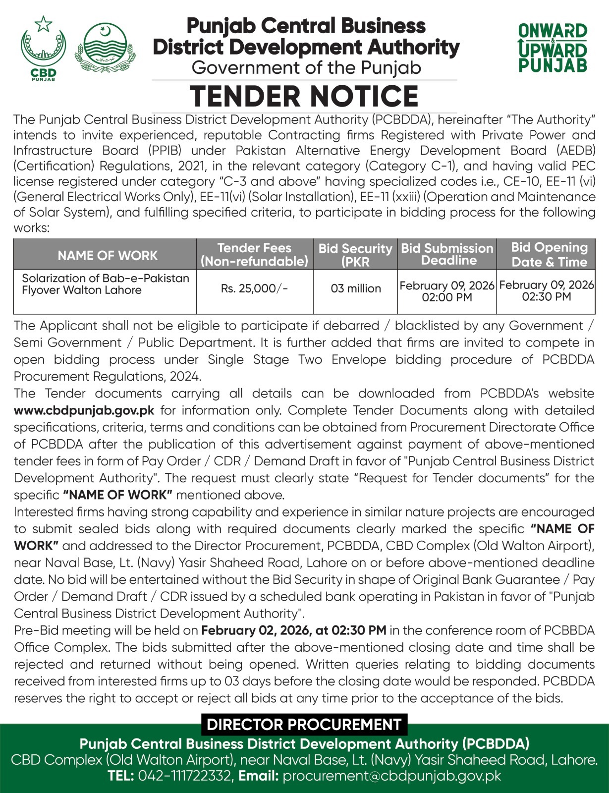 Tender Notice - Solarization of Bab e Pakistan Flyover Walton Lahore |