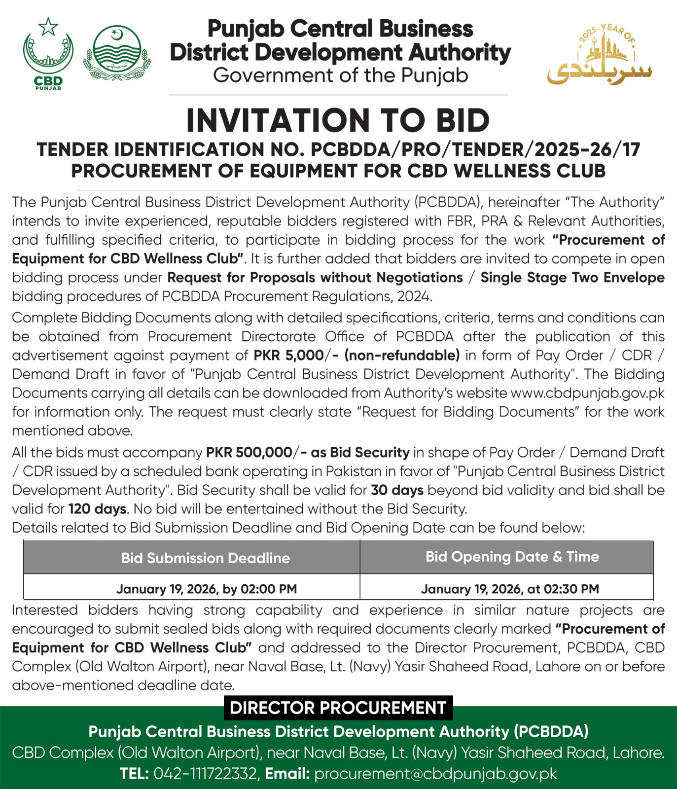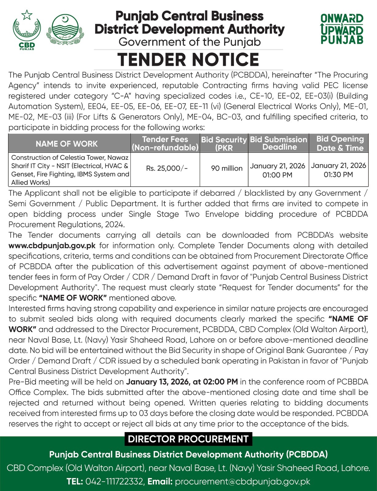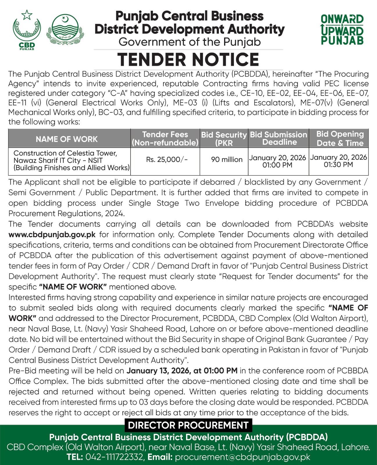 Tender Notice - Construction of CBD - The Walk Complex at CBD Quaid, Lahore |